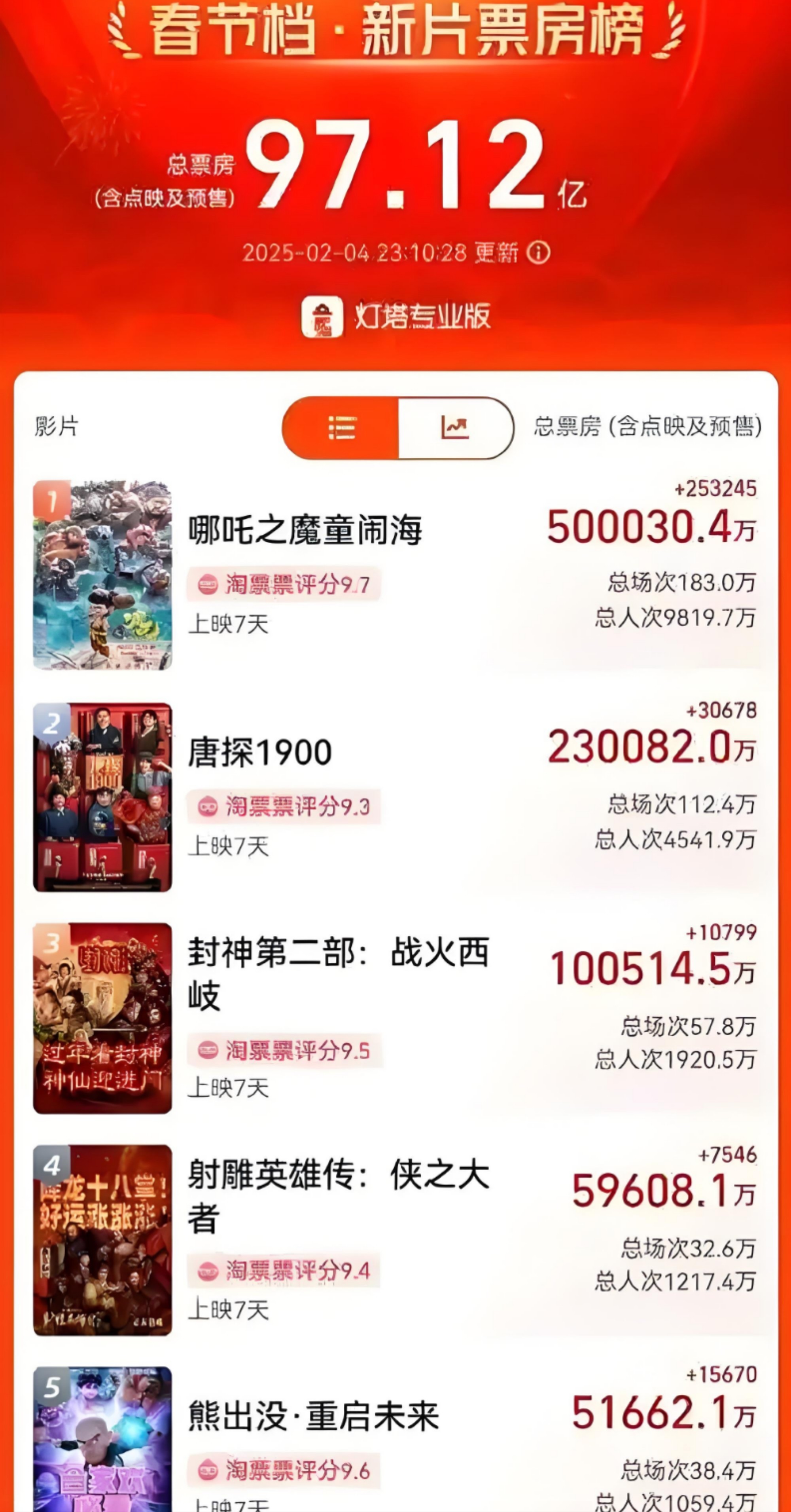手脚春节档的最大赢家,《哪吒之魔童闹海》无疑还是紧紧占据了票房榜首。凭借其出色的质料与雄壮的粉丝基础,这部影片不仅在票房上屡创佳绩,还有望创造影史据说。颠倒是在竞争敌手《唐探1900》以镇静的发扬屈居第二的情况下,《哪吒2》险些毫无悬念地锁定了春节档的冠军宝座。