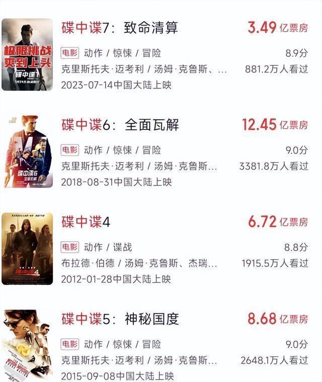02票房大不如前,异邦影片窘境依然自满 诚然这部《碟中谍8》在内地比迪士尼新作更受原谅,但要是让影片跟它的前作们比较较,票房差距亦然一目了然。 远的不说,就看4年前上映的《碟中谍6》,在内地票房齐大致冲破12.45亿,含金量可念念而知。