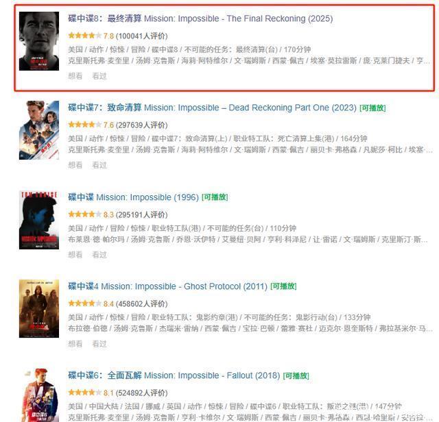 同期,电影在豆瓣评分达到7.8分,依旧享有可以的口碑成绩。 仅仅相较于这个系列的前边几部作品,评分和热度不算太高,那么究竟这一次《碟中谍8》值不值得不雅众去看呢?