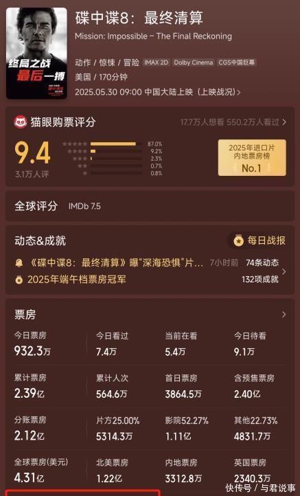 2年前受市集大环境影响,国表里电影票房齐受到了一定冲击,《碟中谍7》在内地票房仅获利3.49亿,依然严重下滑了。 本以为本年第八部影片上映后能找回往日的风范,可以剑指十亿票房大关,没念念到展望最终总票房也不外是冲破4.73亿。