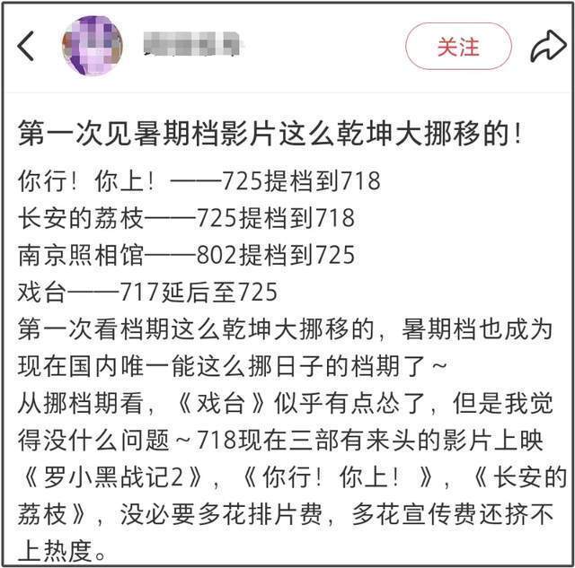 掐指一算,7月18日一天之内,就有9部新片同期上映,其中就包括两部提档新片,永诀是大鹏自编自导自演新片《长安的荔枝》和姜文自编自导自演新片《你行!你上!》,两者来势汹汹,原定于7月17日上映的新片《戏台》很快就官宣宽限上映了。