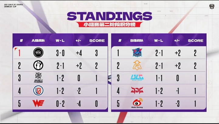 积分榜情况:B组LNG/OMG暂列前二,BLG遭爆冷后跌至组内第三。