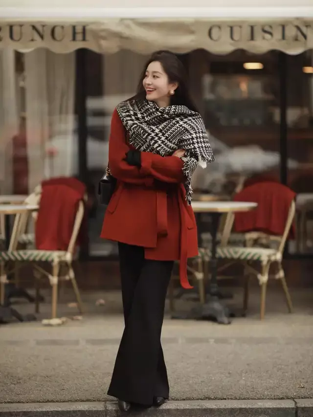 举例上头就用了红色短大衣搭配玄色毛衣,加上玄色微喇叭长裤脚穿玄色的高跟单鞋,这样的造型谁见了你齐夸你一声面子漂亮,并且呈现的视觉后果很喜庆。