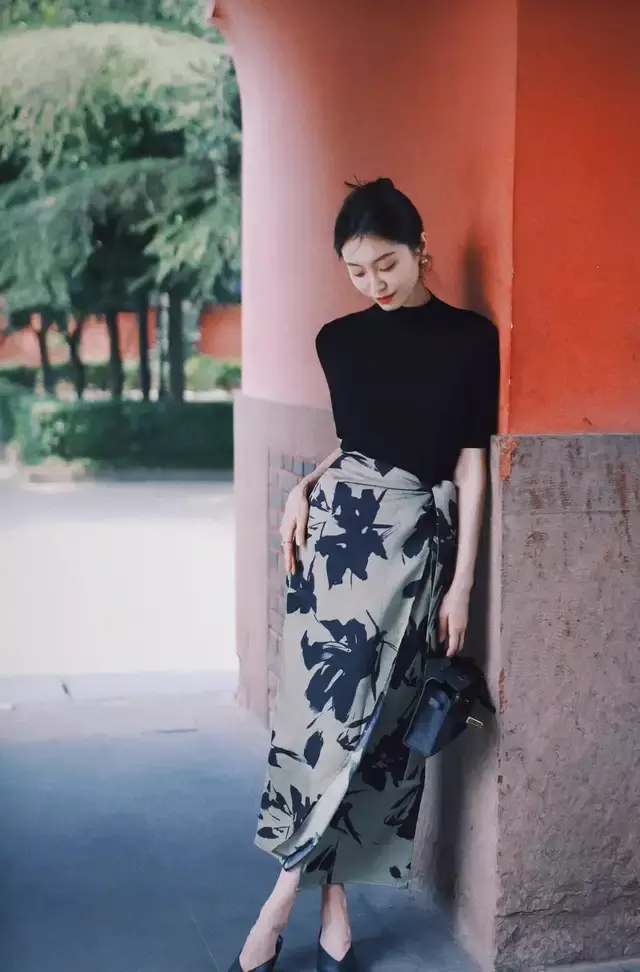 第三章节:除了新考取外衣,还可以接纳什么样的一稔来搭配,让我方变得愈加深重?Tips①:玄色毛衣搭配印花半身裙