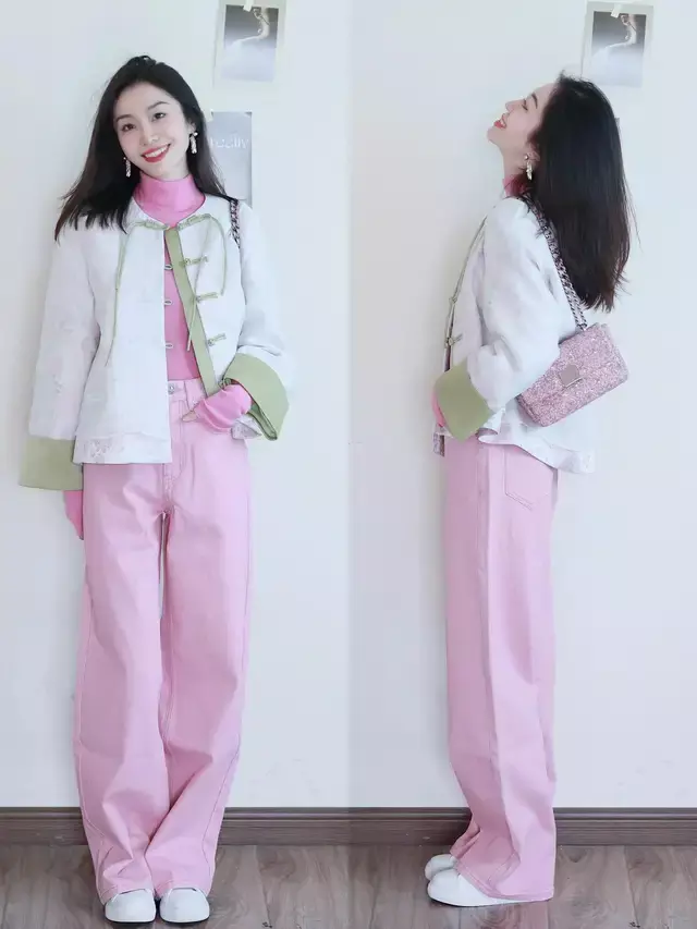 用裤子来搭配新考取的外衣确乎很可以,接纳直筒裤或是直筒阔腿裤就可以穿在身上,能让你变得愈加干练,并且能遮住腿部过错,以上这种蓝色牛仔裤和粉色的牛仔裤。