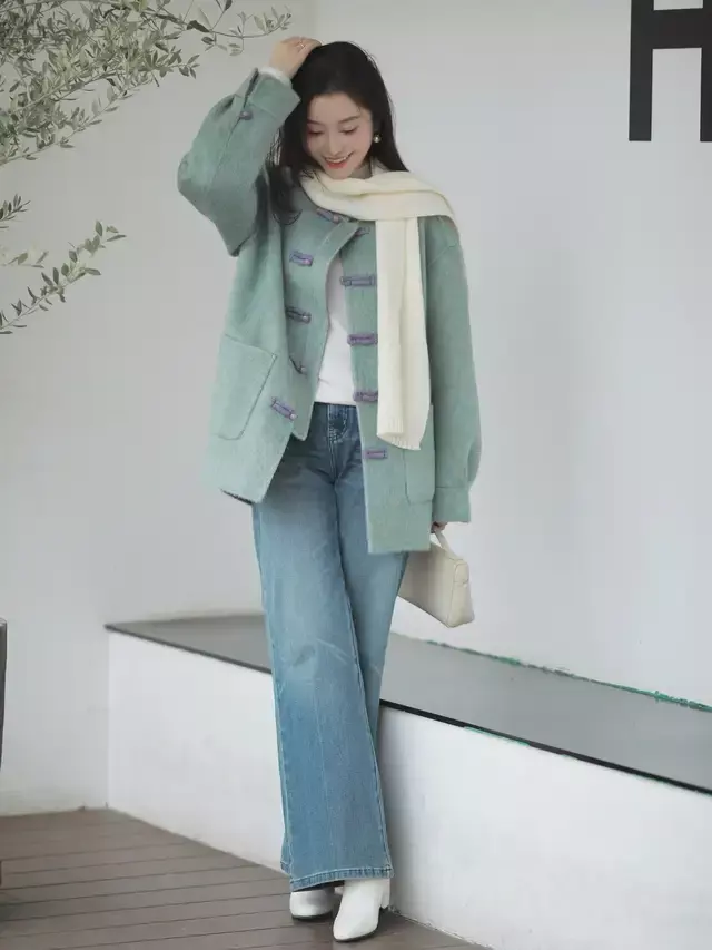 职场上班的你完全可以学习鉴戒上头这一套穿搭,用浅绿色和紫色纽扣组合的新考取短外衣,内搭一件白色的打底衫和一条经典的牛仔直筒长裤,脚穿白色短靴,再用浅黄色的领巾来点缀,这样的打扮御寒快意又干练,谁穿谁好意思。