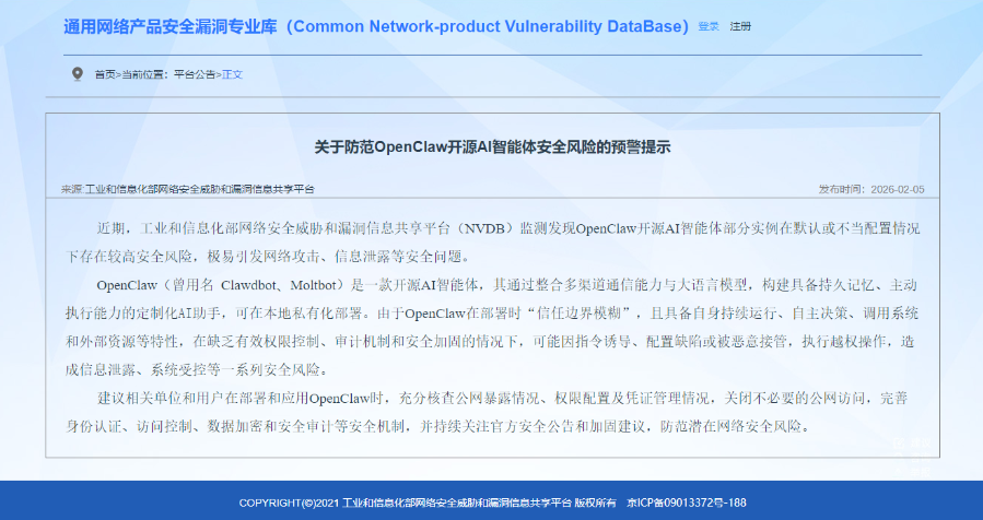 近期,工业和信息化部汇注安全挟制和缝隙信息分享平台(NVDB)监测发现OpenClaw开源AI智能体部分实例在默许或不妥树立情况下存在较高安全风险,极易激勉汇注挫折、信息裸露等安全问题。