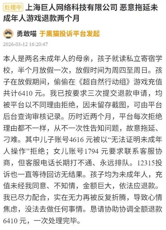 举例,3月12日,又名家长投诉称,“本东说念主是两名未成年东说念主的母亲,孩子在休假时候在《超当然算作组》游戏充值盘算推算6410元。我已按条目三次提交退款苦求,均被平台以不同根由拒却。历时近两个月,平台每次拒却根由齐不同样,从不一次性见告问题,成心拖延、刁难。其中女儿账号4616元被以‘无法解释未成年东说念主操作’拒却;女儿账号1794元条目有筹商客服协商,但客服电话经久打欠亨、长期列队。”