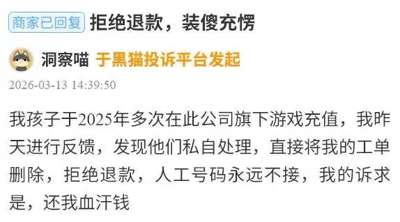 其中,3月13日,又名用户投诉称,“我孩子于2025年屡次在巨东说念主收集旗下流戏充值。我昨天进行反馈,发现他们暗地处理,径直将我的工单删除,拒却退款,东说念主工号码长期不接。”