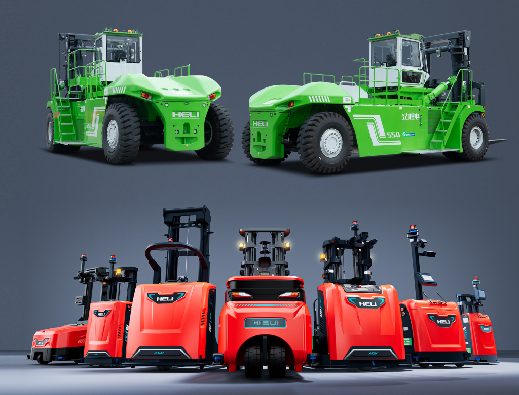 协力55吨锂电叉车和协力i系列智能工业车辆居品。受访者供图